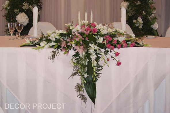 Композиция из живых цветов на стол президиума. Примерная длина 80 см. Возможна любая цветовая гамма.