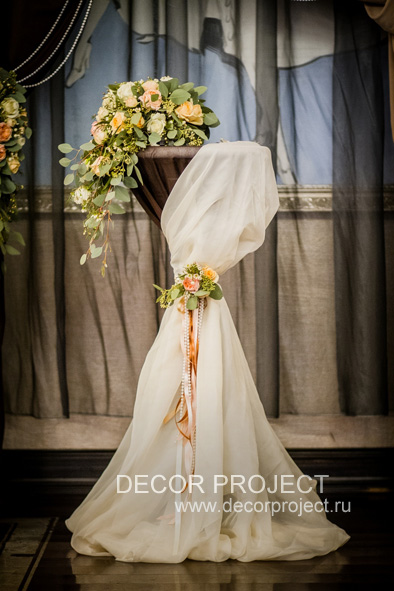 Столик для выездной регистрации с тканевой драпировкой из двух видов ткани с декором атласной лентой. Декор живыми цветами оплачивается дополнительно (+250р). Крупногабаритный товар.