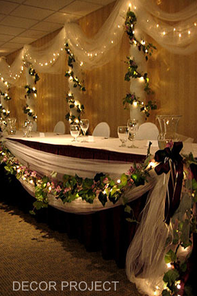 Одинарная тканевая волна (фатин или органза) с подсветкой, декоративной зеленью и вкраплениями живых цветов — на стол до 4 метров длиной. При длине стола до 2 метров стоимость составит 3500 рублей.