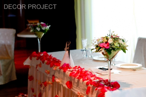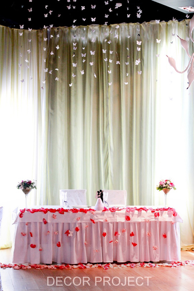 Декор стола живыми и декоративными лепестками, живыми цветами, бабочками — на стол до 4 метров. При длине стола до 2 метров стоимость составит 3000 рублей.